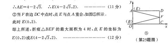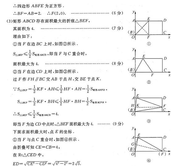 (2)如圖②、甲在矩形ABCD,當(dāng)它的“折痕△BEF”的頂點(diǎn)E位于AD的中點(diǎn)時(shí),畫(huà)出這個(gè)“折痕△BEF”,并求出點(diǎn)F的坐標(biāo);