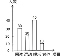 某中學為了了解該校學生的課余活動情況,從閱讀、運動、娛樂、其他等四個方面調(diào)查了若干名學生的興趣愛好,并將調(diào)查結(jié)果繪制了如下兩幅不完整的統(tǒng)計圖(圖1,圖2),請你根據(jù)統(tǒng)計圖中提供的信息解答下列問題: