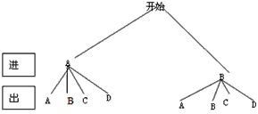 (本題滿分8分)為慶祝中國共產(chǎn)黨建黨90周年,6月中旬我市某展覽館進(jìn)行黨史展覽,把免費(fèi)參觀票分到學(xué)校。展覽館有2個(gè)驗(yàn)票口A、B(可進(jìn)出),另外還有2個(gè)出口C、D(不許進(jìn))。小張同學(xué)憑票進(jìn)入展覽大廳,參觀結(jié)束后離開。
