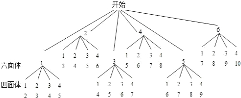 正四面體各面分別標(biāo)有數(shù)字1、2、3、4,正六面體各面分別標(biāo)有數(shù)字1、2、3、4、5、6,同時(shí)擲這兩個(gè)正多面體,并將它們朝下面上的數(shù)字相加.![]()