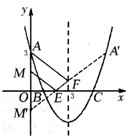 | (3)如圖,由題意,可得M(0, 點(diǎn)M關(guān)于x軸的對(duì)稱點(diǎn)為M'(0,- 點(diǎn)A關(guān)于拋物線對(duì)稱軸x=3的對(duì)稱點(diǎn)為A'(6,3) 連結(jié)A'M' 根據(jù)軸對(duì)稱性及兩點(diǎn)間線段最短可知,A'M'的長(zhǎng)就是所求點(diǎn)P運(yùn)動(dòng)的最短總路徑的長(zhǎng) 所以A'M'與x軸的交點(diǎn)為所求E點(diǎn),與直線x=3的交點(diǎn)為所求F點(diǎn) 可求得直線A'M'的解析式為y= 可得E點(diǎn)坐標(biāo)為(2,0),F(xiàn)點(diǎn)坐標(biāo)為(3, 由勾股定理可求出A'M'= 所以點(diǎn)P運(yùn)動(dòng)的最短總路徑(ME+EF+FA)的長(zhǎng)為 |