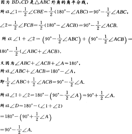 如圖所示,在△ABC中,BD,CD分別是△ABC的外角∠ABC,∠ACB的角平分線,試說明∠D=90°-