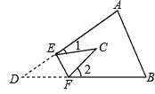| 解:∵∠A=65°,∠B=75°, ∴∠DEF+∠DFE=∠A+∠B=140°, ∴∠DEF+∠DFE+∠CEF+∠CFE=280°, ∴∠2=360°-(∠DEF+∠DFE+∠CEF+∠CFE)-∠1=360°-280°-20°=60° |