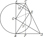 分析:(1)作輔助線,連接OE,過(guò)點(diǎn)C作CF⊥BD于點(diǎn)F,可證:四邊形ABFC為矩形,根據(jù)切線的性質(zhì)和AC,BD的長(zhǎng)可知CD和FD的長(zhǎng),根據(jù)勾股定理可將CF即⊙O的直徑求出,進(jìn)而可將⊙O的半徑求出;在Rt△OAC中,根據(jù)OA和AC的長(zhǎng),可將AM的長(zhǎng)求出,進(jìn)而可將AE的長(zhǎng)求出;
