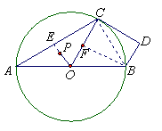 | (1)解:延長OP交AC于E, ∵ P是△OAC的重心,OP= ∴ OE=1, 且 E是AC的中點(diǎn). ∵ OA=OC, ∴ OE⊥AC. 在Rt△OAE中, ∵ ∠A=30°,OE=1, ∴ OA=2. ∴ ∠AOE=60° ∴ ∠AOC=120° ∴ (2)證明:連結(jié)BC. ∵ E、O分別是線段AC、AB的中點(diǎn), ∴ BC∥OE,且BC=2OE=2=OB=OC. ∴ △OBC是等邊三角形. ∴ ∠OBC=60°. ∵ ∠OBD=120°, ∴ ∠CBD=60°=∠AOE. ∵ BD=1=OE,BC=OA, ∴ △OAE ≌△BCD. ∴ ∠BCD=30° ∵ ∠OCB=60°, ∴ ∠OCD=90° ∴ CD是⊙O的切線. |
