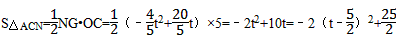 | (3)在直線AC的下方的拋物線上存在點(diǎn)N,使△NAC面積最大, 設(shè)N點(diǎn)的橫坐標(biāo)為t,此時(shí)點(diǎn)N(t, 過點(diǎn)N作NG∥y軸交AC于G; 由點(diǎn)A(0,4)和點(diǎn)C(5,0)可求出直線AC的解析式為:y=﹣ 把x=t代入得:y=﹣ 此時(shí):NG=﹣ ∴, ∴當(dāng)t= 由t= ∴N( |