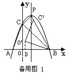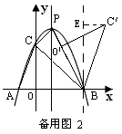 | (2)①如圖,頂點P為(1,4), CP BP 又因為 所以∠PCB=90°, 又因為O′C′ ∥CP,所以O(shè)′C′⊥BC, 所以點O′在BC上, 所以α=45°; ②如備用圖1,當(dāng)BC′與BP重合時, 過點O′作O′D⊥OB于D, 因為∠PBC+∠CBO′=∠CBO′+∠ABO′=45°, 所以∠ABO′=∠PBC, 則△DBO′∽△CBP, 所以 所以BD=3O′D, 設(shè)O′D= x,則BD=3x, 根據(jù)勾股定理, 得 所以BD 所以點O′的坐標(biāo)為 如備用圖2,當(dāng)BO′與BP重合時,過點B作x軸的垂線BE, 過點C′作C′E⊥BE于E, 因為∠PBE+∠EBC′=∠PBE+∠CBP=45°, 所以∠EBC′=∠PBC, 所以△EBC′∽△CBP, 所以 所以BE=3C′E, 設(shè)C′E為y,則BE=3y, 根據(jù)勾股定理, 得 所以BE 所以C′的坐標(biāo)為 |