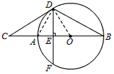 | 解:(1)證明:連接OD, ∵直線CD與⊙O相切于點D, ∴OD⊥CD, ∴∠CDO=90°, ∴∠CDE+∠ODE=90°, 又∵DF⊥AB, ∴∠DEO=∠DEC=90°, ∴∠EOD+∠ODE=90°, ∴∠CDE=∠EOD, 又∵∠EOD=2∠B, ∴∠CDE=2∠B; (2)連接AD, ∵AB是圓O的直徑, ∴∠ADB=90°, ∵BD∶AB= ∴在Rt△ADB中,cosB= ∴∠B=30°, ∴∠AOD=2∠B=60°, 又∵在Rt△CDO中,CD=10, ∴OD=10tan30°= 在Rt△CDE中,CD=10,∠C=30°, ∴DE=CDsin30°=5, ∵弦DF⊥直徑AB于點E, ∴DE=EF= ∴DF=2DE=10。 |