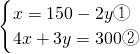 ①代入②得,4(150-2y)+3y=300,