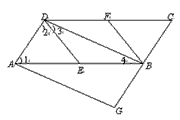 | 解:(1)證明:∵四邊形ABCD是平行四邊形, ∴∠1=∠C,AD=CB,AB=CD ∵點(diǎn)E 、F分別是AB、CD的中點(diǎn), ∴AE= ∴AE=CF ∴△ADE≌△CBF (2)當(dāng)四邊形BEDF是菱形時,四邊形AGBD是矩形, ∵四邊形ABCD是平行四邊形, ∴AD∥BC , ∵AG∥BD , ∴四邊形 AGBD 是平行四邊形 ∵四邊形 BEDF 是菱形, ∴DE=BE , ∵AE=BE , ∴AE=BE=DE, ∴∠1=∠2,∠3=∠4, ∵∠1+∠2+∠3+∠4=180°, ∴2∠2+2∠3=180°, ∴∠2+∠3=90°,即∠ADB=90°, ∴四邊形AGBD是矩形。 |