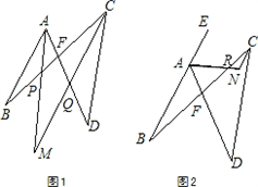 ⑴∠BAD和∠BCD的角平分線交于點M(如圖1),求∠AMC的大;