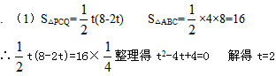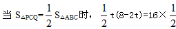 (2)△PCQ的面積能否為△ABC面積的一半?若能,求出t的值,若不能,說明理由。