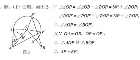 (1)點(diǎn)P在右半弧上(∠BOP是銳角),將OP繞點(diǎn)O逆時(shí)針旋轉(zhuǎn)80°得OP′.