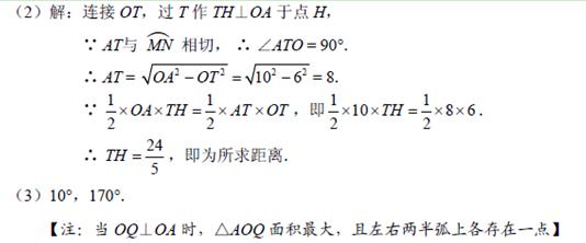(2)點(diǎn)T在左半弧上,若AT與弧相切,求點(diǎn)T到OA的距離;