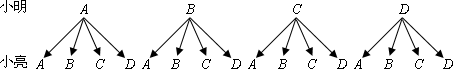 “六一”兒童節(jié),小明與小亮受邀到科技館擔(dān)任義務(wù)講解員,他們倆各自獨(dú)立從A區(qū)(時(shí)代輝煌)、B區(qū)(科學(xué)啟迪)、C區(qū)(智慧之光)、D區(qū)(兒童世界)這四個(gè)主題展區(qū)中隨機(jī)選擇一個(gè)為參觀者服務(wù).