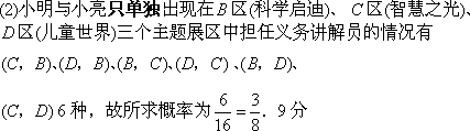(2)求小明和小亮只單獨(dú)出現(xiàn)在C區(qū)(智慧之光)、D區(qū)(兒童世界)兩個(gè)主題展區(qū)中擔(dān)任義務(wù)講解員的概率。