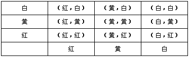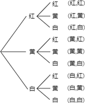 一布袋中有紅、黃、白三種顏色的球各一個(gè),它們除顏色外其它都一樣。小亮從布袋中摸出一個(gè)球后放回去搖勻,再摸出一個(gè)球。請(qǐng)你利用列舉法(列表或畫樹狀圖)分析并求出小亮兩次都能摸到白球的概率。