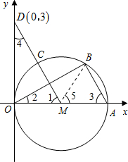 已知:如圖,直徑為OA的⊙M與x軸交于點O、A,點B、C把弧 CA分為三等份,連接MC并延長交y軸于點D(0,3)