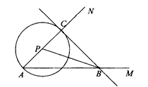 已知:如圖,∠MAN=45°,B為AM上的一個定點, 若點P在射線AN上,以P為圓心,PA為半徑的圓與射線AN的另一個交點為C,請確定⊙P的位置,使BC恰與⊙P相切.![]()