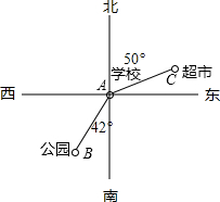 如圖,A、B、C三點(diǎn)分別表示學(xué)校、公園、超市,若公園在學(xué)校的南偏西42°,超市在學(xué)校的北偏東50°,則圖中∠BAC的度數(shù)為