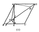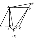 | (2)證明:在DP上截取DH=EF(如圖(1)), ∵四邊形ABCD是平行四邊形,AE⊥BC, ∴∠EAD=90°, ∵EF⊥PD,∠1=∠2, ∴∠ADH=∠AEF, ∵AD=AE, ∴△ADH≌△AEF, ∴∠HAD=∠FAE,AH=AF, ∴∠FAH=90°, 在Rt△FAH中,AH=AF, ∴ ∴FH=FD-HD=FD-EF, 即 |