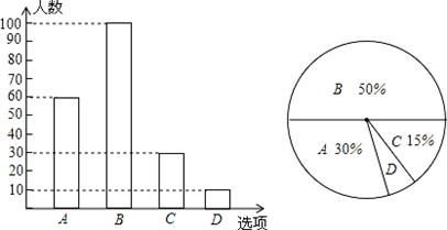 (2)在條形統(tǒng)計圖中將選項D的部分補充完整.