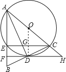 分析:(1)首先連接OD,由AC為直徑,根據(jù)直徑所對(duì)的圓周角是直角,可得∠ADC=90°,又由AB=AC,可得BD=CD,繼而可得OD是△ABC的中位線,即可得OD∥AB,由DF⊥AB,則可證得OD⊥FH,則可得FH為⊙O的切線;
