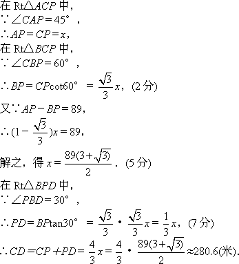 .當小明向正北前進了89米到達B處時,又測得橋墩C在北偏西60°,橋墩D在北偏東30°,那么萬平口大橋的橋跨長度CD是多少米?(結(jié)果精確到0.1米)(參考數(shù)據(jù)