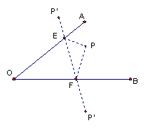 如圖所示,分別作點(diǎn)P關(guān)于OA、OB的對(duì)稱點(diǎn)P′、P′′,連結(jié)P′P′′,交OA于點(diǎn)E,則點(diǎn)E為第一次的觸壁點(diǎn)。