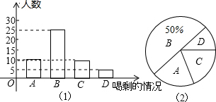生活中很多礦泉水沒有喝完便被扔掉,造成極大的浪費,為此數(shù)學興趣小組的同學對某單位的某次會議所用礦泉水的浪費情況進行調(diào)查,為期半天的會議中,每人發(fā)一瓶500ml的礦泉水,會后對所發(fā)礦泉水喝的情況進行統(tǒng)計,大至可分為四種:A:全部喝完;B:喝剩約