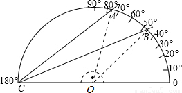 如圖,量角器外緣上有A、B、C三點,其中A、B兩點所表示的讀數(shù)分別是80º、50º,則∠ACB等于 ____º.![]()