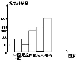 根據(jù)《2001年上海環(huán)境建設(shè)藍(lán)皮書》統(tǒng)計(jì),部分國際城市的人均垃圾排放量(單位:千克/年)為:美國紐約657,日本東京475,法國巴黎402,菲律賓馬尼拉183,中國上海322,根據(jù)上述信息,制作統(tǒng)計(jì)圖,要求盡可能地形象。