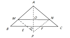 | (2)過點(diǎn)A作AD⊥BC于D,交MN于O, ∵M(jìn)N∥BC, ∴AO⊥MN, ∴△AMN∽△ABC, ∴ ∵AB=AC=5,BC=6,AD⊥BC, ∴∠ADB=90°,BD= ∴AD=4, ∴ ∴AO= ∴S△AMN= 當(dāng)AO≤ 根據(jù)題意得:S△PMN=S△AMN, ∴△MNP與等腰△ABC重疊部分的面積為S△AMN, ∴ ∴當(dāng)AO= 當(dāng)AO> ∵M(jìn)N∥BC, ∴AP⊥BC,△AMN∽△ABC,△PEF∽△PMN∽△AMN, ∴ 即: ∴AO= ∴ ∴EF=2x-6,OD=AD-AO=4- ∴y=S梯形MNFE= ∴當(dāng)x=4時,y有最大值,最大值為4, 綜上所述:當(dāng)x=4時,y的值最大,最大值是4。 |