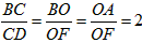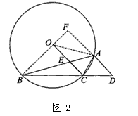 | 解:(1)如圖1,連結(jié)OB, ∵⊙O的內(nèi)接△ABC中,∠BAC=45°, ∴∠BOC=2∠BAC=90°, ∵OB=OC, ∴∠OBC=∠OCB=45°, ∵AD∥OC, ∴∠D=∠OCB=45°; (2)∵∠BAC=45°,∠D=45°, ∴∠BAC=∠D, ∵AD∥OC, ∴∠ACE=∠DAC, ∴△ACE∽△DAC, ∴ ∴AC2=AD·CE; (3)如圖2,延長BO交DA的延長線于F,連結(jié)OA, ∵AD∥OC, ∴∠F=∠BOC=90°, ∵∠ABC=15°, ∴∠OBA=∠OBC-∠ABC=30°, ∵OA=OB, ∴∠FOA=∠OBA+∠OAB=60°,∠OAF=30°, ∴ ∵AD∥OC, ∴△BOC∽△BFD, ∴ ∴ |