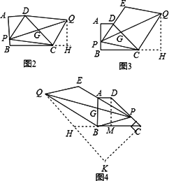分析:?jiǎn)栴}1:四邊形PCQD是平行四邊形,若對(duì)角線PQ、DC相等,則四邊形PCQD是矩形,然后利用矩形的性質(zhì),設(shè)PB=x,可得方程x2+32+(2-x)2+1=8,由判別式△<0,可知此方程無實(shí)數(shù)根,即對(duì)角線PQ,DC的長(zhǎng)不可能相等; 問題2:在平行四邊形PCQD中,設(shè)對(duì)角線PQ與DC相交于點(diǎn)G,可得G是DC的中點(diǎn),過點(diǎn)Q作QH⊥BC,交BC的延長(zhǎng)線于H,易證得Rt△ADP≌Rt△HCQ,即可求得BH=4,則可得當(dāng)PQ⊥AB時(shí),PQ的長(zhǎng)最小,即為4; 問題3:設(shè)PQ與DC相交于點(diǎn)G,PE∥CQ,PD=DE,可得 問題4:作QH∥PE,交CB的延長(zhǎng)線于H,過點(diǎn)C作CK⊥CD,交QH的延長(zhǎng)線于K,易證得 解答:解:?jiǎn)栴}1:∵四邊形PCQD是平行四邊形, 若對(duì)角線PQ、DC相等,則四邊形PCQD是矩形, ∴∠DPC=90°, ∵AD=1,AB=2,BC=3, ∴DC=2 設(shè)PB=x,則AP=2-x, 在Rt△DPC中,PD2+PC2=DC2,即x2+32+(2-x)2+1=8, 化簡(jiǎn)得x2-2x+3=0, ∵△=(-2)2-4×1×3=-8<0, ∴方程無解, ∴對(duì)角線PQ與DC不可能相等. 問題2:如圖2,在平行四邊形PCQD中,設(shè)對(duì)角線PQ與DC相交于點(diǎn)G, 則G是DC的中點(diǎn), 過點(diǎn)Q作QH⊥BC,交BC的延長(zhǎng)線于H, ∵AD∥BC, ∴∠ADC=∠DCH,即∠ADP+∠PDG=∠DCQ+∠QCH, ∵PD∥CQ, ∴∠PDC=∠DCQ, ∴∠ADP=∠QCH, 又∵PD=CQ, ∴Rt△ADP≌Rt△HCQ, ∴AD=HC, ∵AD=1,BC=3, ∴BH=4, ∴當(dāng)PQ⊥AB時(shí),PQ的長(zhǎng)最小,即為4. 問題3:如圖3,設(shè)PQ與DC相交于點(diǎn)G, ∵PE∥CQ,PD=DE, ∴ ∴G是DC上一定點(diǎn), 作QH⊥BC,交BC的延長(zhǎng)線于H, 同理可證∠ADP=∠QCH, ∴Rt△ADP∽R(shí)t△HCQ, 即 ∴CH=2, ∴BH=BG+CH=3+2=5, ∴當(dāng)PQ⊥AB時(shí),PQ的長(zhǎng)最小,即為5. 問題4:如圖3,設(shè)PQ與AB相交于點(diǎn)G, ∵PE∥BQ,AE=nPA, ∴ ∴G是DC上一定點(diǎn), 作QH∥PE,交CB的延長(zhǎng)線于H,過點(diǎn)C作CK⊥CD,交QH的延長(zhǎng)線于K, ∵AD∥BC,AB⊥BC, ∴∠D=∠QHC,∠DAP+∠PAG=∠QBH+∠QBG=90°,∠PAG=∠QBG, ∴∠QBH=∠PAD, ∴△ADP∽△BHQ, ∴ ∵AD=1, ∴BH=n+1, ∴CH=BH+BC=3+n+1=n+4, 過點(diǎn)D作DM⊥BC于M, 則四邊形ABND是矩形, ∴BM=AD=1,DM=AB=2 ∴CM=BC-BM=3-1=2=DM, ∴∠DCM=45°, ∴∠KCH=45°, ∴CK=CH·cos45°= ∴當(dāng)PQ⊥CD時(shí),PQ的長(zhǎng)最小,最小值為