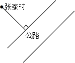 分析:根據(jù)從直線外一點(diǎn)到這條直線上各點(diǎn)所連的線段中垂線段最短,所以過張家村畫一條與公路垂直的線段即可解決問題.