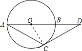 分析:連接OC,由DC是⊙O的切線,則△DCO是直角三角形;由圓周角定理可得∠DOC=2∠CAB=60°,則OD=2OC=20B,BD的長(zhǎng)即可求出.