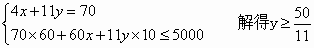 黃岡某地“杜鵑節(jié)”期間,某公司70名職工組團(tuán)前往參觀欣賞,旅游景點(diǎn)規(guī)定:①門票每人60元,無優(yōu)惠;②上山游玩可坐景點(diǎn)觀光車,觀光車有四座和十一座車,四座車每輛60元,十一座車每人10元.公司職工正好坐滿每輛車且總費(fèi)用不超過5000元,問公司租用的四座車和十一座車各多少輛?