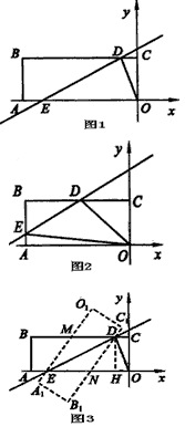 | 解:(1)由題意得B(-3,1),若直線經(jīng)過點(diǎn)A(-3,0)時(shí),則 若直線經(jīng)過點(diǎn)B(-3,1)時(shí),則 若直線經(jīng)過點(diǎn)C(0,1)時(shí),則b=1, ① 若直線與折線OAB的交點(diǎn)E在OA邊上時(shí),即 此時(shí)E(-2b,0), ∴ ②若直線與折線OAB的交點(diǎn)E在BA邊上時(shí),即 此時(shí)E(-3, ∴ = ∴S與b的函數(shù)關(guān)系式為: (2)如圖3,設(shè)O1A1與CB相交于點(diǎn)M,OA與C1B1相交于點(diǎn)N,則矩形 由題意,知DM∥NE,DM∥ME, ∴四邊形DNEM為平行四邊形, 根據(jù)軸對(duì)稱知,∠MED=∠NED,又∠MDE=∠NED, ∴∠MED=∠MDE, ∴MD=ME, ∴四邊形DNEM為菱形, 過點(diǎn)D作DH⊥OA,垂足為H,由題意知, 設(shè)菱形的邊長(zhǎng)為a,則在Rt△DHN中,由勾股定理知 ∴S菱形DNEM=NE·DH= 則矩形 |