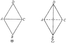 | 解:(1)若對角線AC=12cm,如圖甲所示. ∵四邊形ABCD是菱形 ∴∠DAC=∠BAC= ∴AB=BC=CD=AD,AD∥BC ∴∠DAC=∠ACB,∠DAB+∠B=180° ∵∠DAB=120° ∴∠DAC=∠BAC=∠ACB=∠B=60° ∴△ABC為等邊三角形 ∴AB=AC=AC=12cm 即菱形ABCD的邊長為12cm; (2)若對角線BD=12cm,如圖乙所示. 連接AC,交BD于點(diǎn)O. ∵四邊形ABCD是菱形 ∴AC∥BD,AB∥CD, AD=CD=AB=BC,∠BAO=∠DAO= OA= ∴∠DAB+∠ADC=180°,∠BAO=∠DCA,OD=6cm ∵∠DAB=120° ∴∠ADC=∠BAO=∠DAO=∠DCA=60° ∴△ADC為等邊三角形 ∴AC=AD ∴OA= 設(shè)OA=x,則AD=2x ∵AC⊥BD ∴AD2=AO2+OD2 即(2x)2=x2+62 ∴x=2 ∴AD=2×2 ∴AD=CD=AB=BC=4 即菱形的邊長為4 綜上所述,菱形的邊長為12cm或4 |