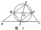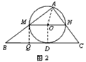 | (2)如圖2,設(shè)直線BC與⊙O相切于點D,連結(jié)AO、OD, 則AO=OD= 在Rt△ABC中, 由(1)知△AMN∽△ABC, ∴ ∴ ∴ 過M點作MQ⊥BC 于Q,則 在Rt△BMQ與Rt△BCA中,∠B是公共角, ∴△BMQ∽△BCA, ∴ ∴ ∴x= ∴當x= |