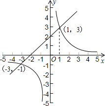 (2)如圖,用描點法畫出函數圖象并由計算得一次函數與反比例函數的交點為(-3,-1)(1,3),…7分