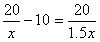 汛期將至,我軍機(jī)械化工兵連的官兵為駐地群眾辦實(shí)事,計(jì)劃加固駐地附近20千米的河堤。根據(jù)氣象部門預(yù)測,今年的汛期有可能提前,因此官兵們發(fā)揚(yáng)我軍不怕苦,不怕累的優(yōu)良傳統(tǒng),早出晚歸,使實(shí)際施工速度提高到計(jì)劃的1.5倍,結(jié)果比計(jì)劃提前10天完成.問該連實(shí)際每天加固河堤多少千米?列方程解此應(yīng)用題時,若計(jì)劃每天加固河堤x千米,則實(shí)際每天加固1.5x千米.根據(jù)題意可列方程為