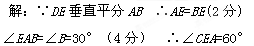 如圖,△ABC中,DE垂直平分AB,且分別交AB、BC于點(diǎn)D、E,若∠B=30°,求∠CEA的度數(shù).