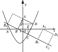 (1)如圖,過點(diǎn)C作CE⊥x軸于點(diǎn)E,過點(diǎn)D作DF⊥y軸于點(diǎn)F.(1分) ∵正方形ABCD中,AB=BC,∠ABC=∠AOB=90°, 即∠1+∠ABO=∠2+∠ABO=90°. ∴∠1=∠2. 在Rt△BCE和Rt△ABO中, ∵∠1=∠2,BC=AB,∠CEB=∠BOA=90°, ∴Rt△BCE≌Rt△ABO.(2分) ∴CE=BO,BE=AO. ∵B(-1,0), ∴BO=1. ∵AB= ∴在Rt△ABO中,由勾股定理,得AO= ∴CE=1,BE=2. ∴OE=BE-BO=1. ∴C(1,-1).(3分) 同理可得△ADF≌△ABO. ∴DF=AO=2,AF=BO=1. ∴OF=AO-AF=2-1=1. ∴D(2,1).(4分) 將C(1,-1)、D(2,1)分別代入y= 可得 解得 ∴此拋物線的表達(dá)式為y= (2)點(diǎn)B1在拋物線上. 理由:根據(jù)題意,得1秒后點(diǎn)B移動(dòng)的長(zhǎng)度為 則BB1= 如圖,過點(diǎn)B1作B1N⊥x軸于點(diǎn)N. 在Rt△ABO與Rt△BNB1中, ∵∠AOB=∠BNB1=90°, ∠2=∠B1BN=90°-∠ABO,AB=B1B, ∴Rt△ABO≌Rt△BB1N. ∴B1N=BO=1,NB=AO=2. ∴NO=NB+BO=2+1=3. ∴B1(-3,1).(8分) 將點(diǎn)B1(-3,1)代入y= (3)如圖,設(shè)正方形ABCD沿射線BC平移后的圖形為正方形A2B2C2D2. ∵∠1=∠2,∠BB2A2=∠AOB, ∴△A2BB2∽△BAO.(10分) ∴ ∵AO=2,BO=1,A2B2= 即 ∴BB2=2 ∴正方形ABCD平移的距離為2