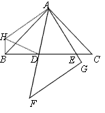 | 解: ∵∠BAE=∠BAD+45°,∠CDA=∠BAD+45° ∴∠BAE=∠CDA 又∠B=∠C=45° ∴ (2)∵ ∴ ∴ m= 自變量n的取值范圍為 (3) 由BD=CE可得BE=CD,即m=n ∵m= ∵OB=OC= ∴BD=OB=OD= ∴BD2+CE2=2BD2=6-4 ∴ (4)成立 證明:如圖,將 則CE=HB,AE=AH,∠ABH=∠C=45°,旋轉(zhuǎn)角∠EAH=90° 連接HD,在 ∵AE=AH, ∠HAD=∠EAH-∠FAG=45°=∠EAD, AD=AD ∴ ∴DH=DE 又∠HBD=∠ABH+∠ABD=90° ∴BD2+HB2=DH2 即BD2+CE2=DE2 |
