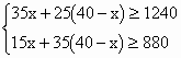 現(xiàn)計劃把甲種貨物1240噸和乙種貨物880噸用一列貨車運往某地,已知這列貨車掛有A、B兩種不同規(guī)格的車廂共40節(jié),如果每節(jié)A型車廂最多可以裝甲種貨物35噸和乙種貨物15噸,每節(jié)B型車廂最多可裝甲種貨物25噸和乙種貨物35噸,裝貨時按此要求安排A、B兩節(jié)車廂的節(jié)數(shù),那么共有幾種安排車廂的方案?