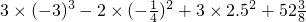 解:將a=-3,b=,c=2.5代入式子3a3-2b2+3c2-(-52)得: