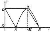 | 解:(1)由拋物線的對稱性可知AM=BM, 在Rt△AOD和Rt△BMC中, ∵OD=MC,AD=BC, ∴△AOD≌△BMC, ∴OA=MB=MA, 設(shè)菱形的邊長為2m, 在Rt△AOD中, 解得m=1, ∴DC=2,OA=1,OB=3, ∴A、B、C三點(diǎn)的坐標(biāo)分別為(1,0)、(3,0)、(2, (2)設(shè)拋物線的解析式為y=a(x-2)2+ 拋物線的解析式為y=- (3)設(shè)拋物線的解析式為y=- 代入D(0, 所以平移后的拋物線的解析式為y=- 平移了5 |