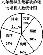 某市“希望”中學(xué)為了了解學(xué)生“大間操”的活動情況,在七、八、九年級的學(xué)生中,分別抽取相同數(shù)量的學(xué)生對“你最喜歡的運動項目”進(jìn)行調(diào)查(每人只能選一項).調(diào)查結(jié)果的部分?jǐn)?shù)據(jù)如下表(圖)所示,其中七年級最喜歡跳繩的人數(shù)比八年級多5人,九年級最喜歡排球的人數(shù)為10人.